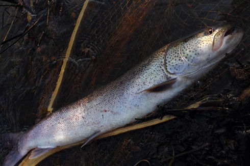 北海道のイトウ産卵期は3〜5月。 そのため多くの釣り人がイトウ釣りを開始するのが5月中旬以降。 秋と違うのは湿原河川も長い冬が開けたばかりで雪代による増水の影響を受けるといった点。 魚自体は産卵で疲れた体力を回復させるためせっせと摂餌行動をとるのだが、河川全体の水位が増水によって高いと如何せんポイントを絞りにくい。 雪代増水は普通の年で5月中旬くらいまで続くが、近年は暖冬の影響から水位の低下が思ったよりも早かったり、または水位自体が思ったほど高くならなかったりとアングラーを迷わせる要素はふんだんにあるものの、そこはやはりドリフトボートの強力なポイントサーチ力でガイドでは安定した釣果を提供することに成功している。 この時期の特徴としては外道で銀鱗見事なサクラマスが釣れてしまうことがあることだ。 5・6月はイトウの狩場とサクラマスの遡上群が場所・タイミング共に一部重複する場合があるので、…おや? この引きは…?? と思ったらイトウならぬ銀の魚体が大ジャンプ… なんてことが稀に起こりうる。 ただし、北海道では河川でのサクラマス釣りは犯罪となるため、もし釣れてしまったら出来るだけ優しく速やかに流れに帰してあげてほしい。